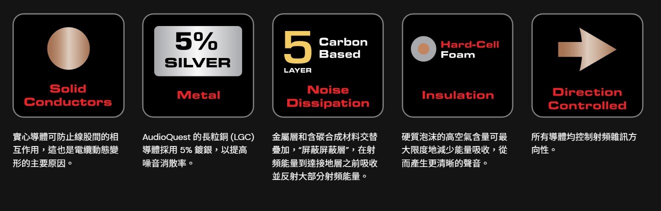 Carbon AES/EBU 採用高純度 5% 純銀導體和 5 層碳基雜訊消散層,可最有效地消散射頻雜訊。