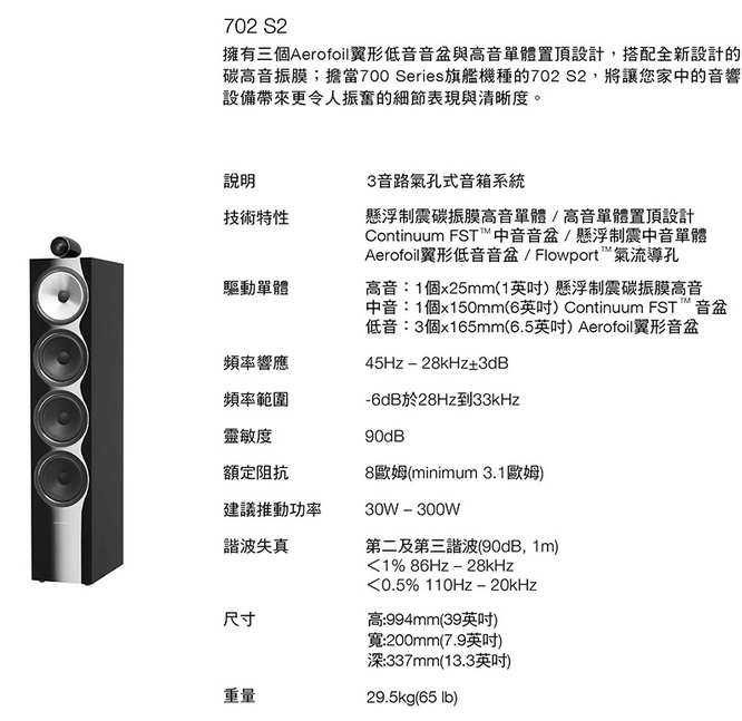 700 系列旗艦落地式喇叭,擁有最先進的聲學科技,包含堅固高音單體外殼包覆的碳高音單體。