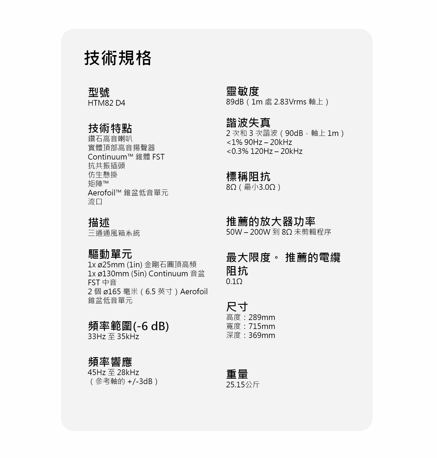對於基於緊湊型803 D4或804 D4配置的家庭影院系統,HTM82 D4中置聲道音箱堪稱完美搭檔。它的中音驅動器單元更加緊湊靈活,輕鬆匹配同系列產品。