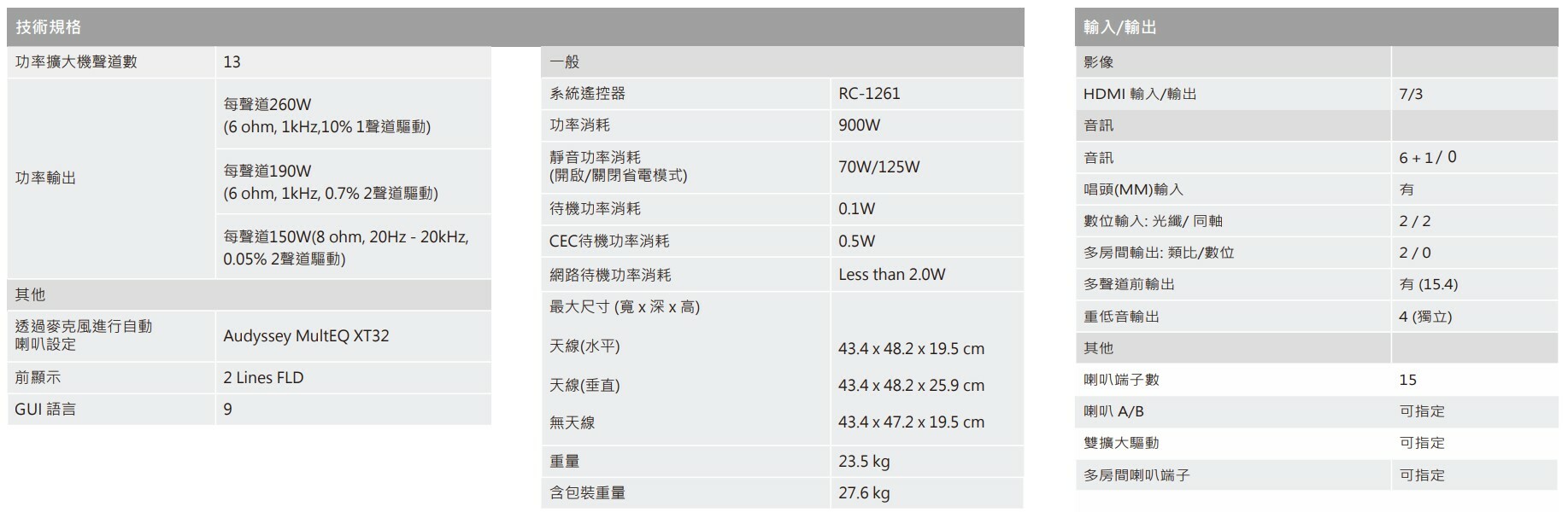 .每聲道260W (6 ohm, 1kHz,10% 1聲道驅動)