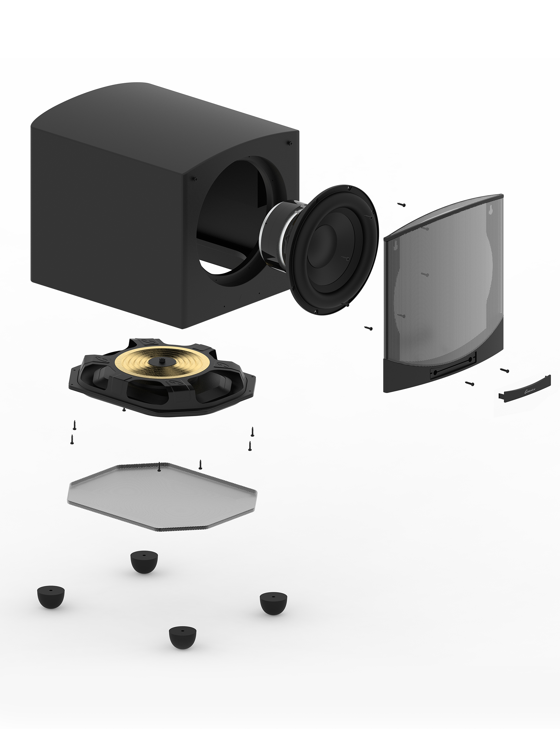 作為 ForceField 系列的旗艦產品,功能強大的 ForceField 40 配備一個 10 英寸超長衝程高輸出低音單元、一個 11 英寸 x 13 英寸向下發射無源輻射器以及一個 1200 瓦 ForceField 數字功放。頻率響應:26Hz – 200Hz;消音響應:31Hz – 170Hz(軸上 -6db)。