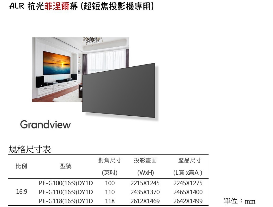 專為雷射電視而設計,可以阻隔上方及側面的環境光源.另外,產品包裝長度僅有1.75公尺,方便運送上高層電梯