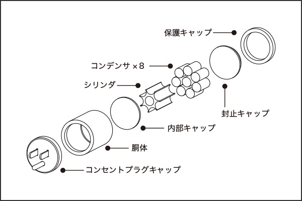 透過將八個雙電層電容器填充到一個電源插座插頭尺寸中,我們成功確保了80,000,000cm2的巨大導體面積,相當於一個足球場的面積(105m x 68m) 。