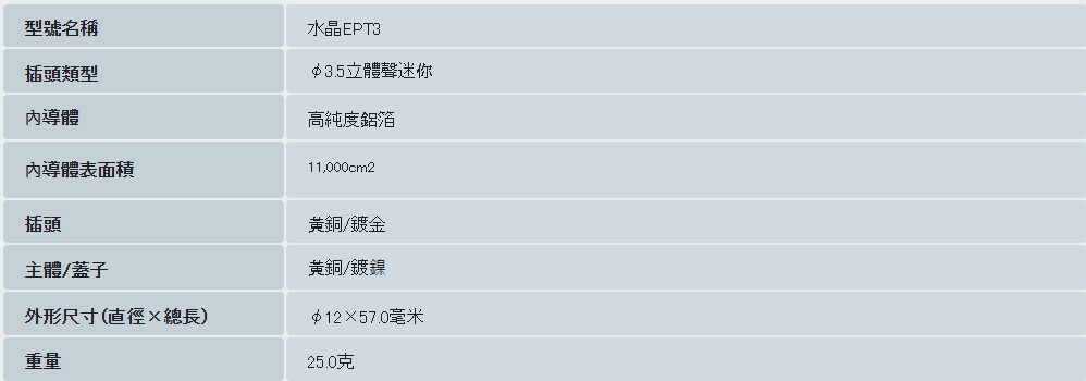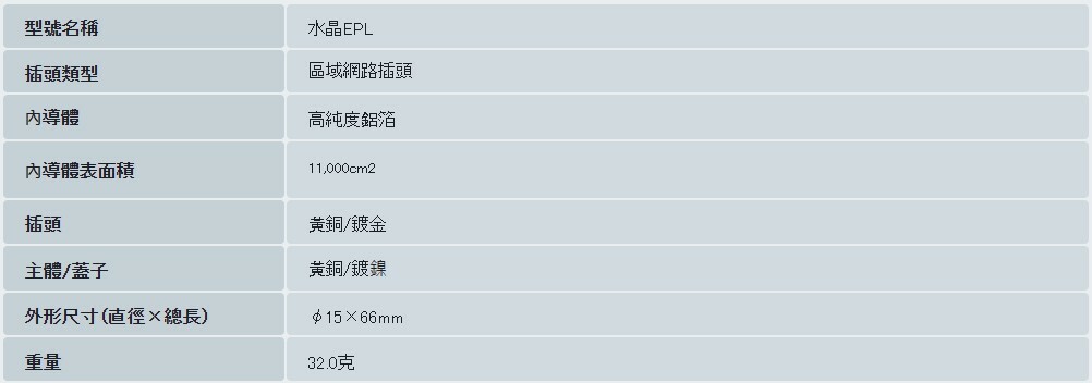 其中,Crystal Ep系列是根據普通RCA插頭的直徑設計的,目的是兼具功能性和美觀性。其外型極為纖薄時尚,採用鍍金/鍍鎳雙色配色,型號名稱和品牌商標也採用微妙的白色絲網印刷設計。