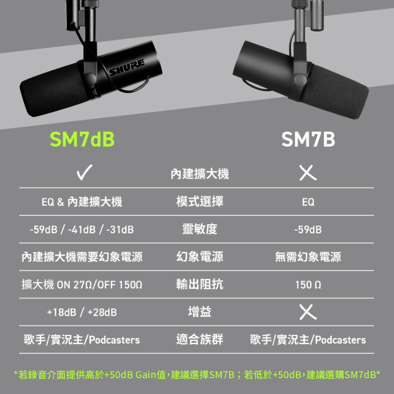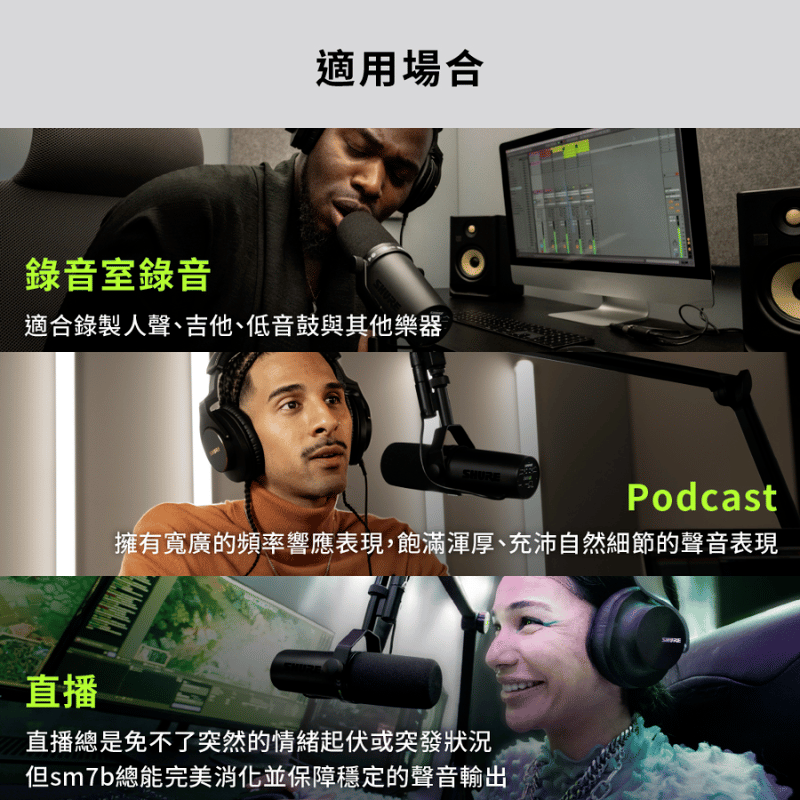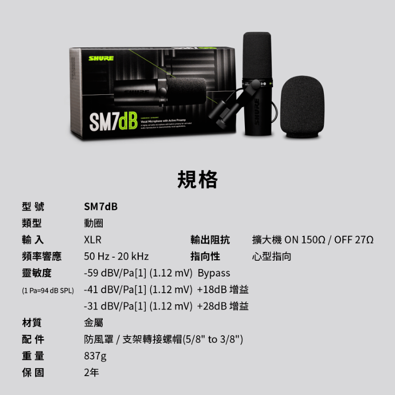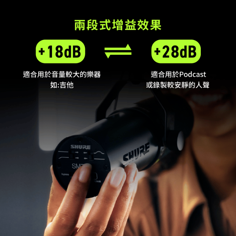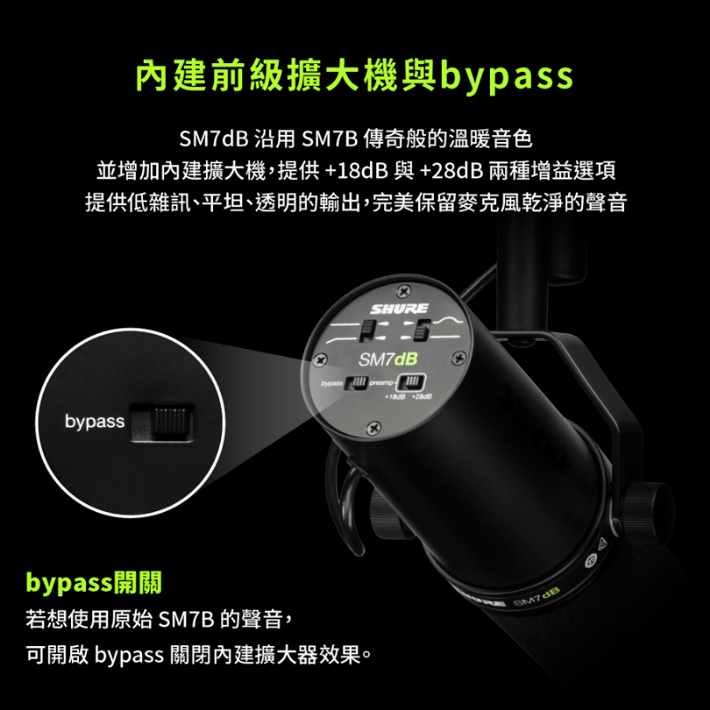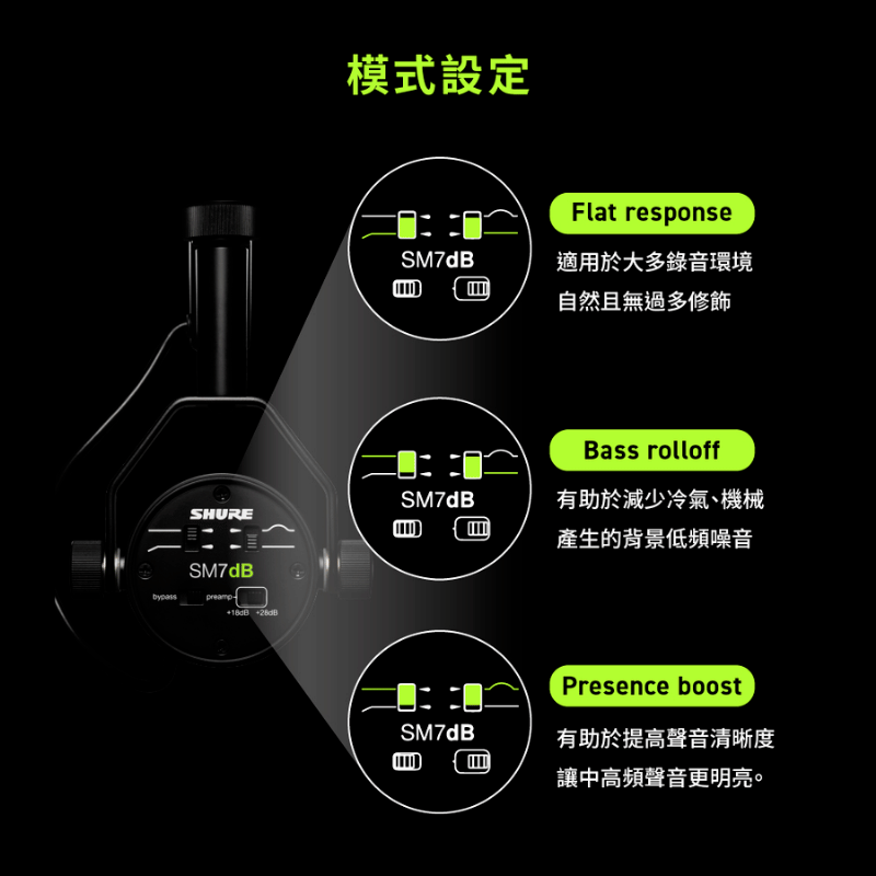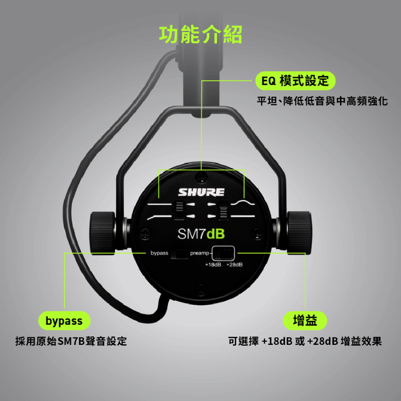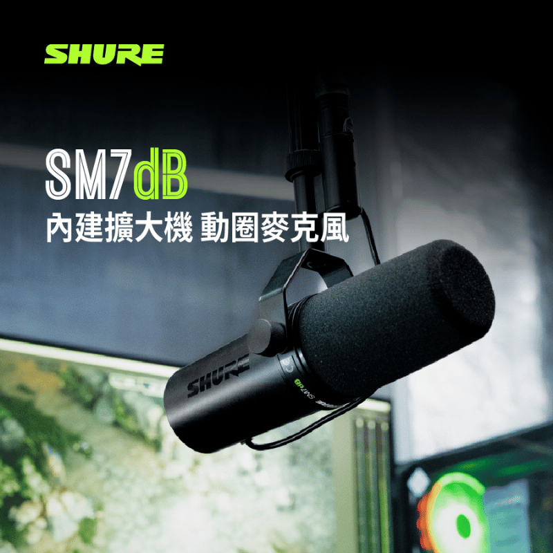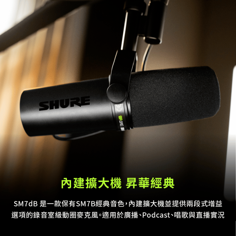 SHURE SM7dB 是一款可以選擇頻率響應的錄音室等級動圈式麥克風,可在近距離收音上表現出飽滿柔和的音質,是近距離人聲收音的理想之選,適用於廣播主持、語音旁白,錄音室人聲收音、唱片收音。