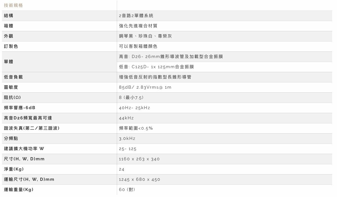 雖是兩音路系統,KAYA 25還是同樣受益於我們的專利錐形導管低音負載,融入真空射出成形的複合材質外殼中,與更大機種的對比,在於指數背波吸收號角巧妙地隱藏在支架中。單件式合金音盆的C125D單體負責中頻與低頻兩部份,如同在較大機種的C100SE,使用了環狀磁石以確保其所負責的頻域上段乾淨、透明的聲音。D26高音裝置在淺凹的導波設計中以配合C125D的擴散性。