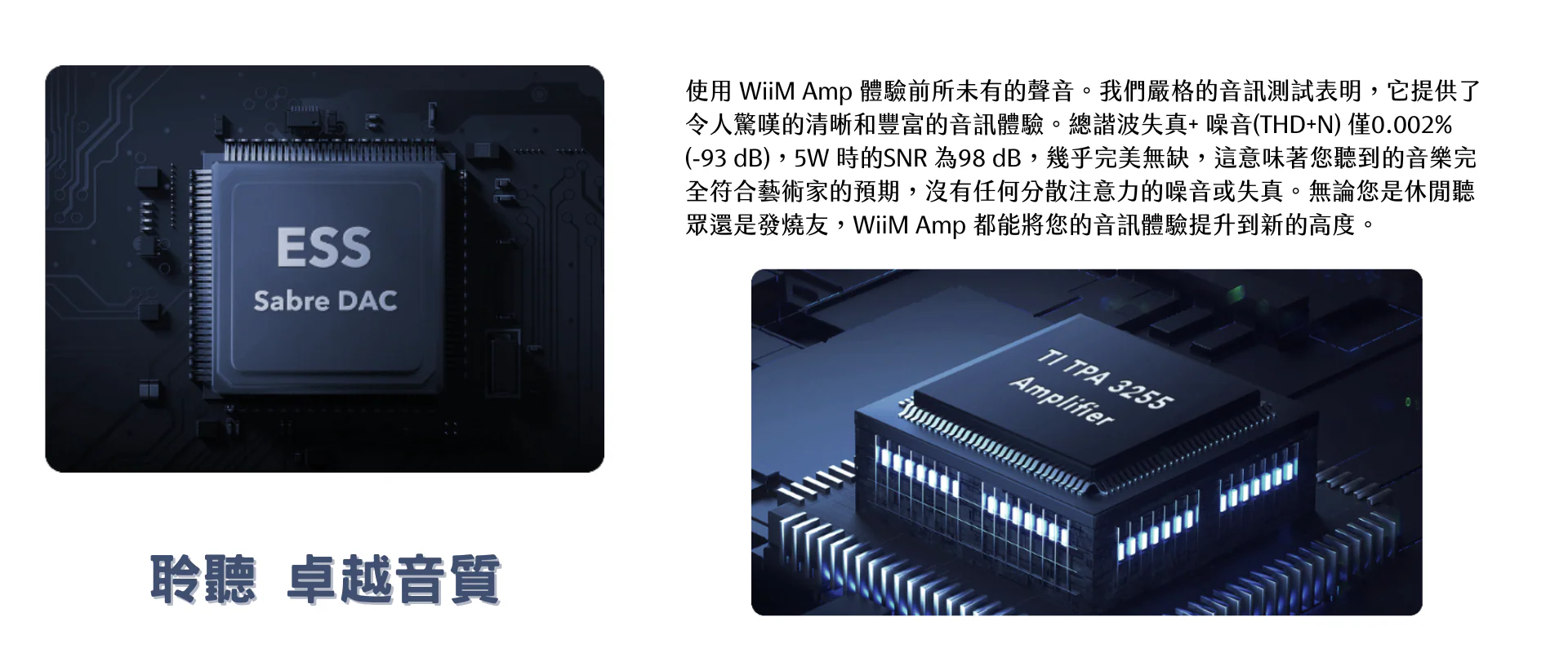 WiiM Amp 搭載性能優異的TI TPA3255 D類功放晶片 + ESS9018 無損解碼DAC(120W@4Ω or 60W@8Ω)